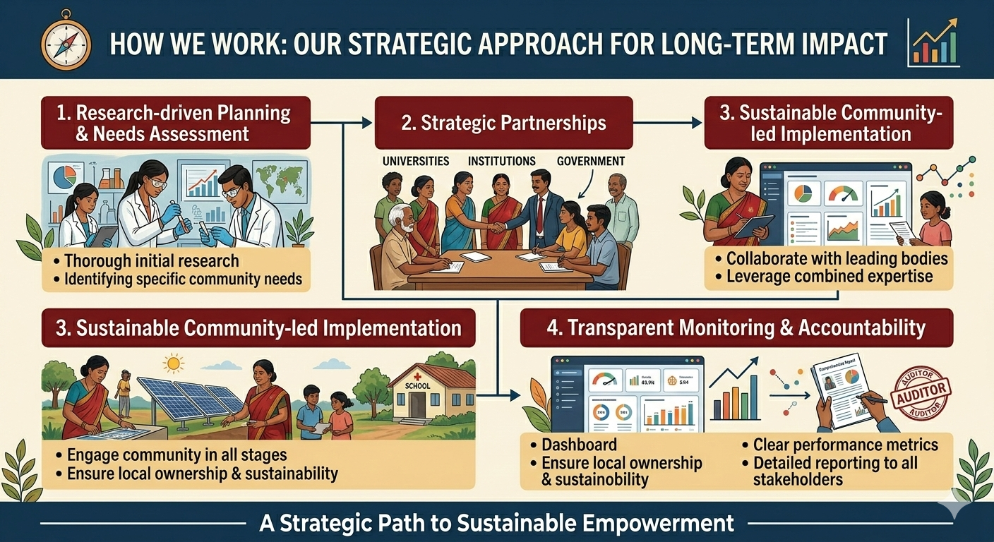 Our work is guided by a strategic and measurable approach that ensures long-term impact: